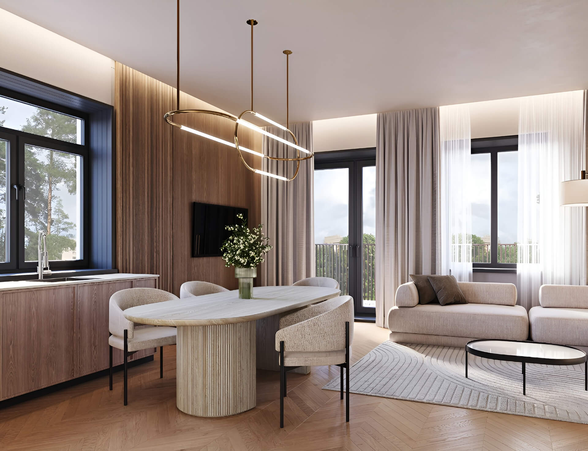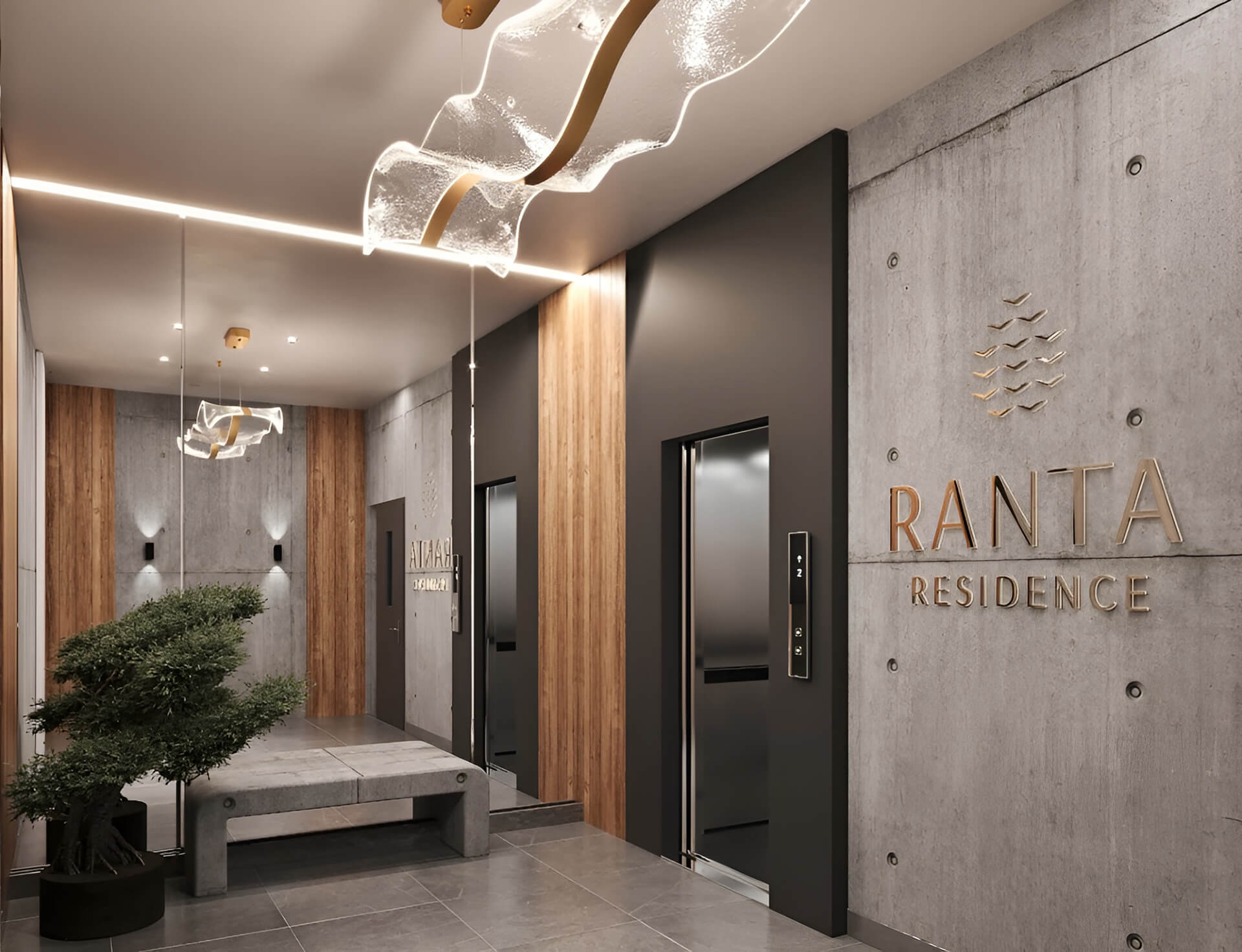 Дизайн холлов в жилых корпусах Ranta Residence выдержан в тёплой природной палитре, где натуральные материалы — дерево, сдержанные текстуры, асимметричные детали — создают атмосферу безмолвной роскоши и благородства. Пространство оборудовано с заботой о жильцах: безбарьерная среда, бесшумные лифты, колясочные и велосипедные комнаты, а также кладовые — всё это делает повседневный вход в дом комфортным и функциональным.