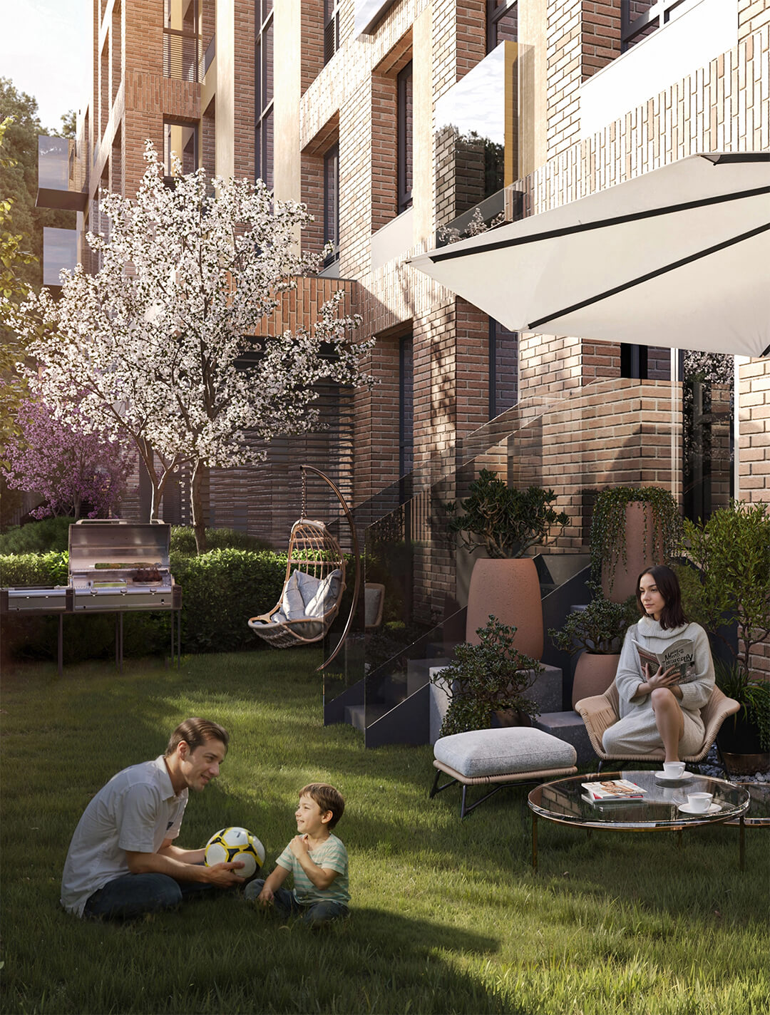 Проект реализуется на территории площадью около 5,4 га, что позволяет встроить благоустроенный двор-парк с извилистыми аллеями, садом скульптур, арт-тропой и зонами барбекю, в гармонии с природным окружением. Здесь нельзя найти шумных коммерческих или общественных объектов: инфраструктура создана исключительно для резидентов. Коворкинг под открытым небом, финские павильоны с очагами, арт-кластеры и спортивные площадки обеспечивают разнообразие сценариев для отдыха и общения, не выезжая за пределы комплекса.