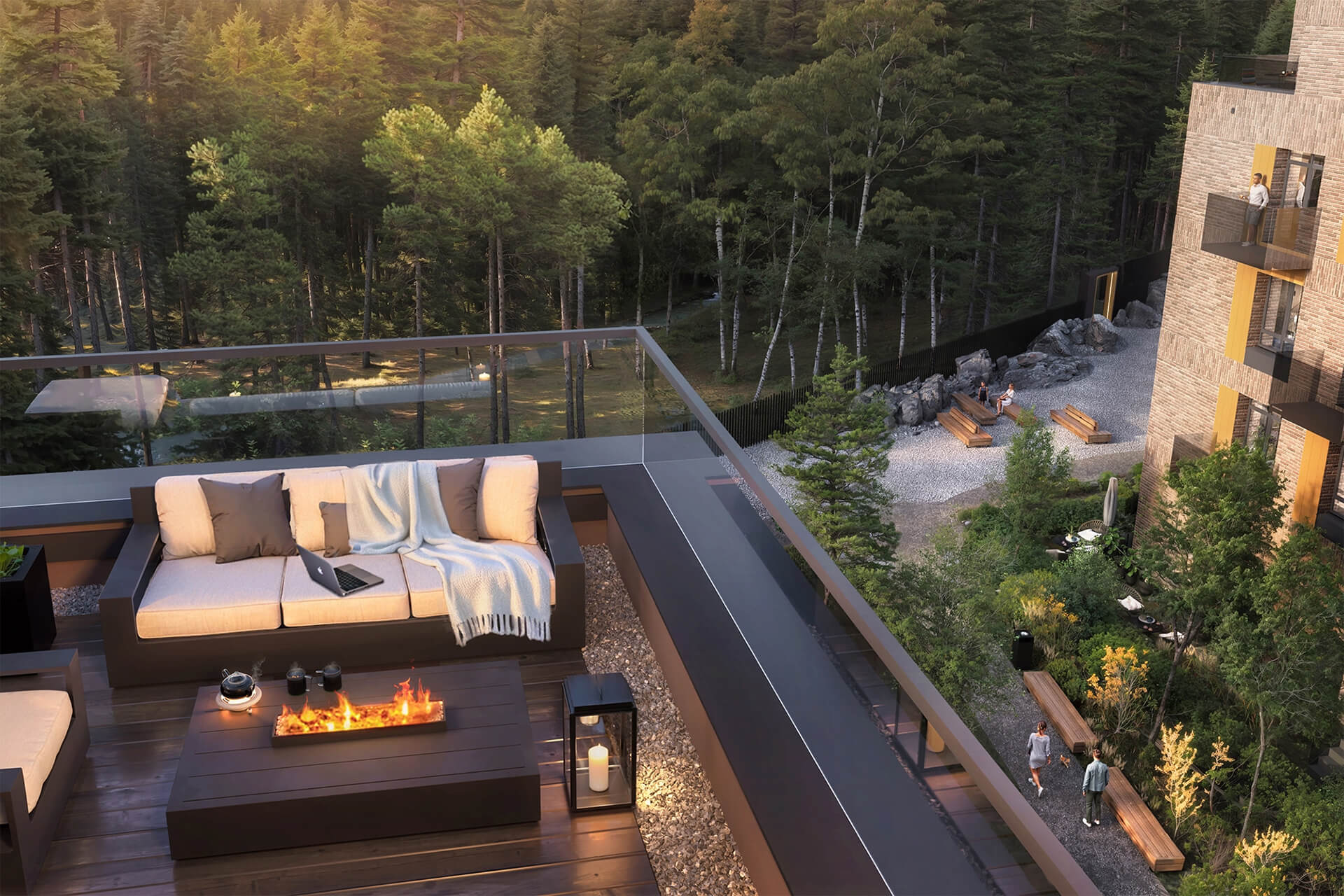 Архитектура ориентирована на максимальное взаимодействие с природой: панорамные окна, террасы и патио раскрывают виды на лес и создают ощущение единения с окружающим ландшафтом. Малый формат, детали из клинкерной плитки, естественная палитра — всё это подчёркивает премиум-статус и создает комфортную визуальную среду.